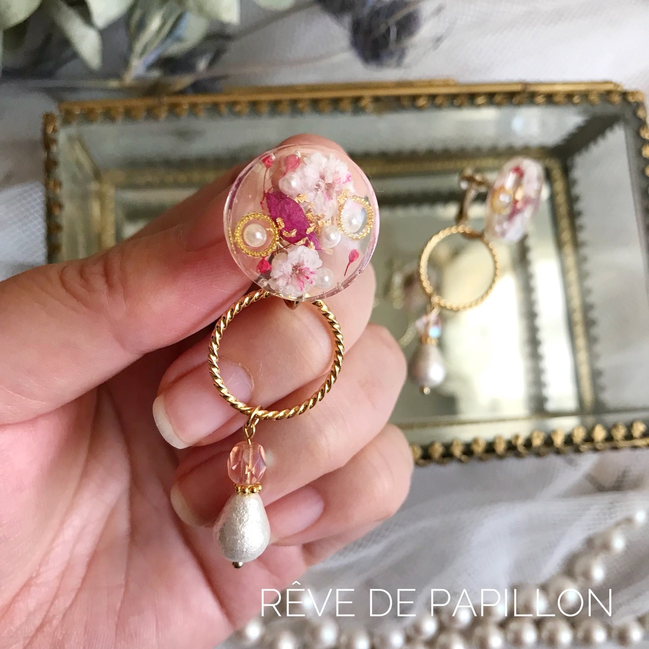 薄桃色のかすみ草、スターチス等に金箔を華やかに散らし、まるで桜の饗宴のような華やかなイヤーアクセサリー。