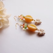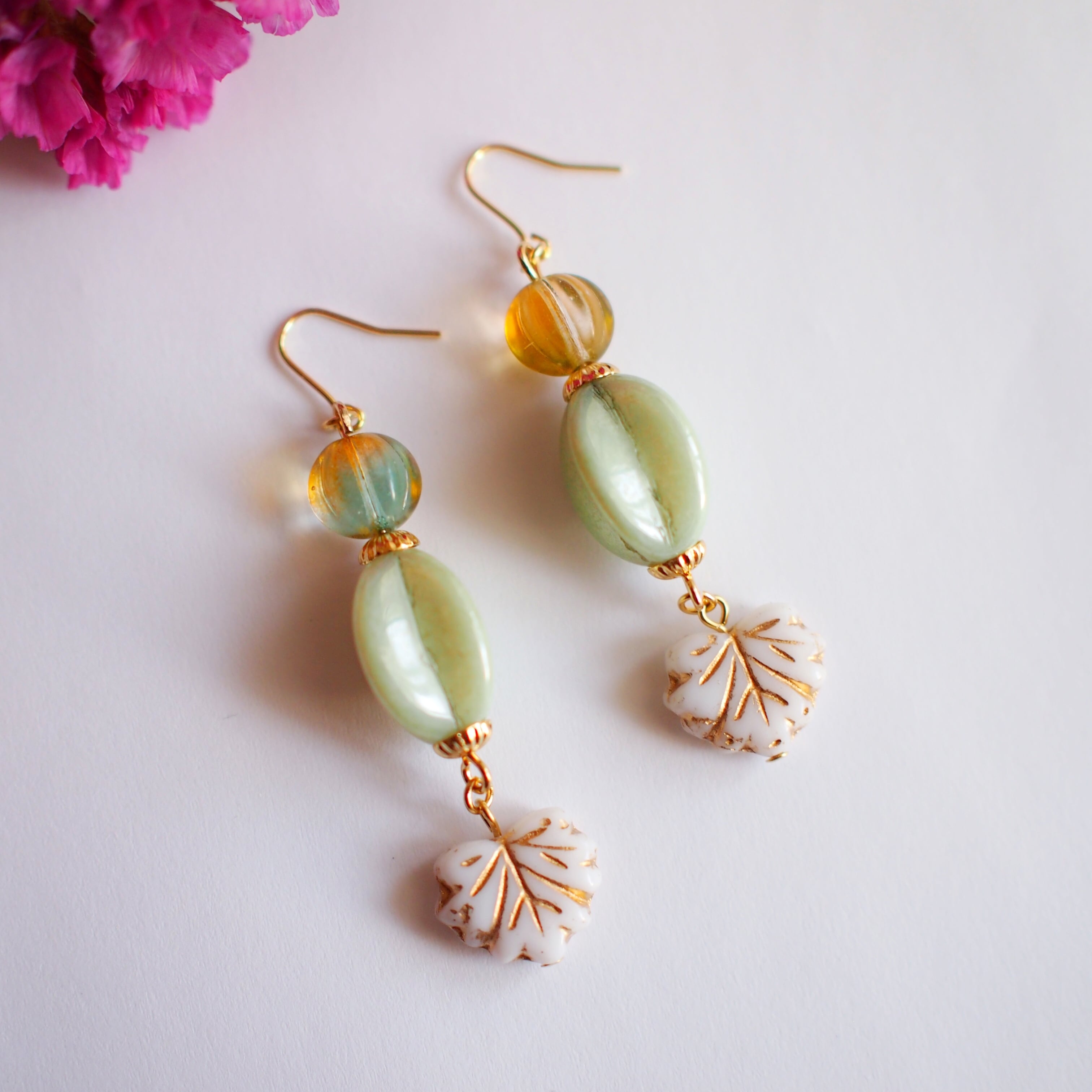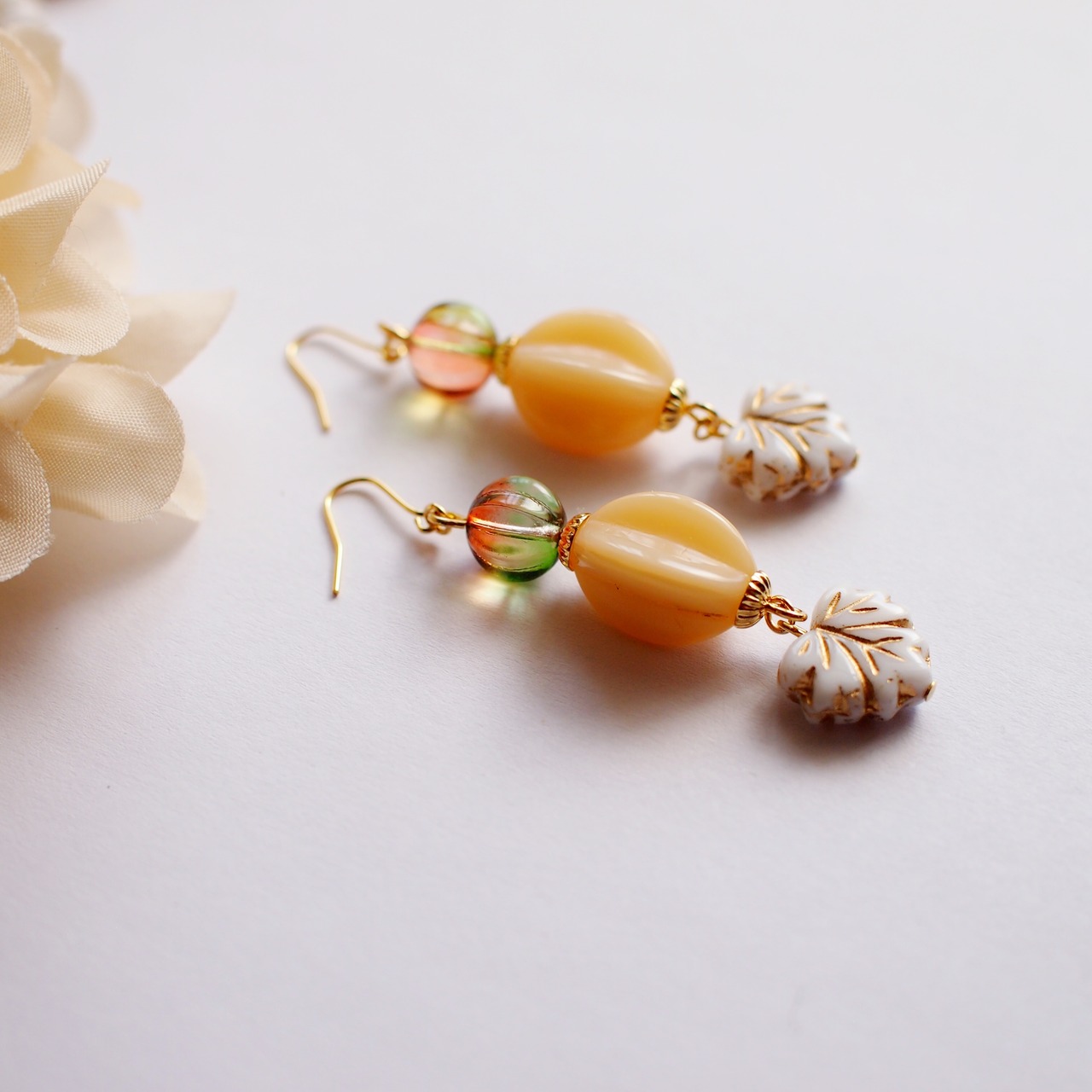オーバルメロン型ビーズやリーフ型ビーズ等を用いて仕立てたイヤーアクセサリー。